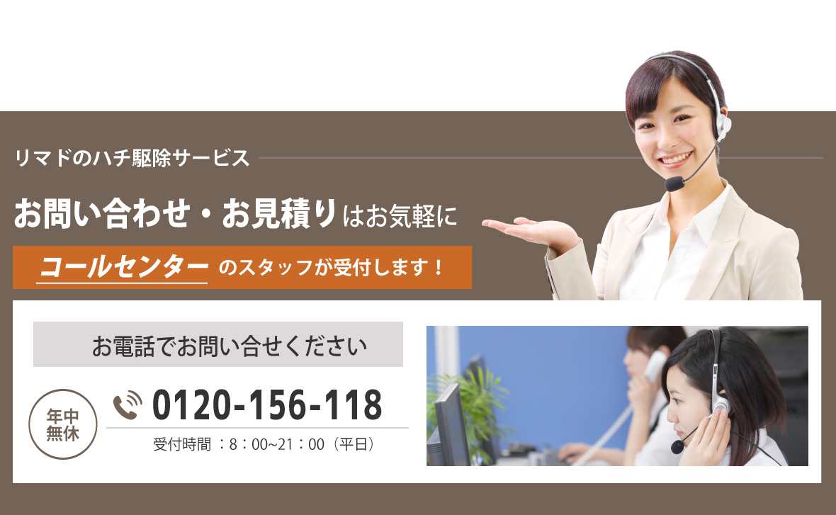 電話をかける(click)ハチ駆除をお考えの際は、プロのハチ駆除業者に依頼することをおすすめいたします。ベランダ、軒下、家の玄関や庭などにハチの巣が作られてしまうと、ハチが部屋の中に入ってしまわないか、ハチに刺されてしまわないかと心配ですよね。また家の周りで蜂が飛んでいると、お隣やご近所の方にもハチ被害でトラブル、ご迷惑をお掛けすることにもなってしまいます。そうなってしまう前にハチ駆除会社に依頼をしてスムーズに解決してしまいものです。それでは、多くの業者の中からどの業者に依頼すればいいのでしょうか?依頼を検討するにあたり、料金や対応の早さ・正確さ、アフターサービスなど気になることは多くありますよね。そこで少しでも低価格、早く、安全、安心に蜂の巣駆除を終わらせるために業者選びで知っておきたいポイントをご紹介します。まず、ハチ駆除料金を比較する際は事前に現地調査を行ってもらいましょう。駆除にかかる費用は、巣の大きさ・場所・高さ、ハチの種類によって変わってきます。また、蜂の巣は軒先や窓際といった場所だけでなく屋根裏(天井裏)、床下といった見つけにくい場所に作られることもあります。そのため正確な見積もりを提示してもらうためにも十分な現地調査は欠かせません。また、駆除の値段はお客様によってそれぞれなので、見積もり価格が業界の相場・適正料金か見極めるのも難しいことかと思います。よくあるトラブルは現地調査が不十分で追加工事・追加料金が発生してしまった、作業費用と清掃費用が別途料金で請求金額が見積りから大きく増えてしまったというものです。そこで見積もりの詳細(内訳)を納得できるまで丁寧にわかりやすく説明してくれる業者が信頼出来る優良業者といえます。また、今日中(本日中)に、翌日にでもハチ駆除を終わらせたいというお客様もみえることかと思います。そこで依頼から即日対応・即日解決・即日駆除ができる業者をおすすめいたします。そして、徹底的にハチ退治、ハチの巣除去をしてもらうために、蜂の巣駆除会社の実績も確認しておきましょう。ハチ駆除には資格や免許、許可などが必要ないので知識や技術がない素人でも作業ができてしまいます。その際、対応が不十分だと戻りバチや蜂の巣の再発といった問題が起きてしまうこともあります。実績豊富な業者であれば、ハチ駆除の知識や技術を持つ専門家のスタッフが駆除から蜂の巣の撤去・処分、再発防止のケアまで行うことができます。また、口コミやランキングサイトで業者の評判も調べてみましょう。評価の高い人気の業者、おすすめされている業者の具体的な対応や施工例など業者選びの参考になるかと思います。弊社では、ご相談、現地調査、お見積もりまで全て無料でご利用頂けます。現地調査の際は、ご依頼から最短40分で駆けつけ、緊急時にもご対応いたします。ミツバチは10,000円から、アシナガバチは11,000円、スズメバチは13,000円から適正料金でハチ駆除サービスをご案内しております。プロの駆除技術にあわせて専用の薬剤を使用することで徹底的な蜂駆除、蜂の巣の除去から、戻り蜂対策、再発予防までしっかりと行います。また、年中無休365日・通話料無料の相談窓口を設けております。ご相談には研修を受けた専門スタッフがご対応いたしますのでちょっとした質問からでも、お気軽にご相談ください。安心・安全にハチ駆除をしたい、ハチ被害でお悩みの方は、まずは弊社にお問い合わせください。